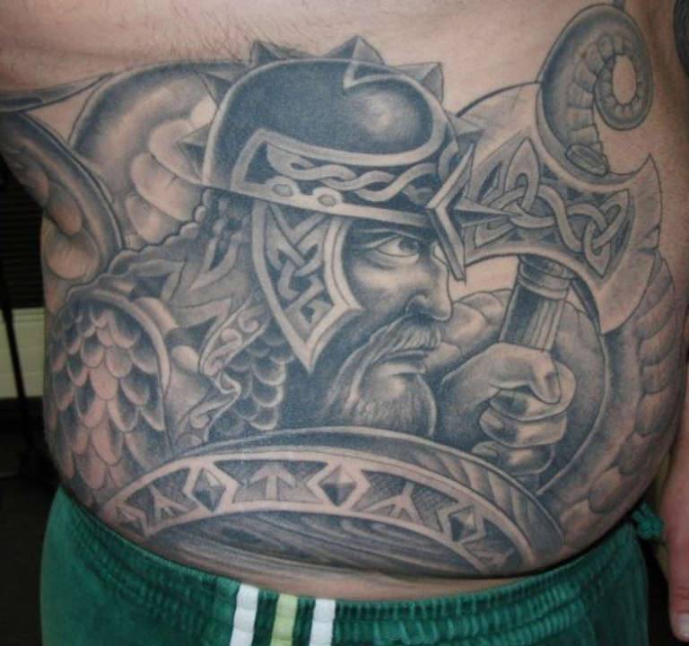 Викинг и медведь – символ мудрости и справедливости в мужчине, бесстрашия в обладателе татуировки.