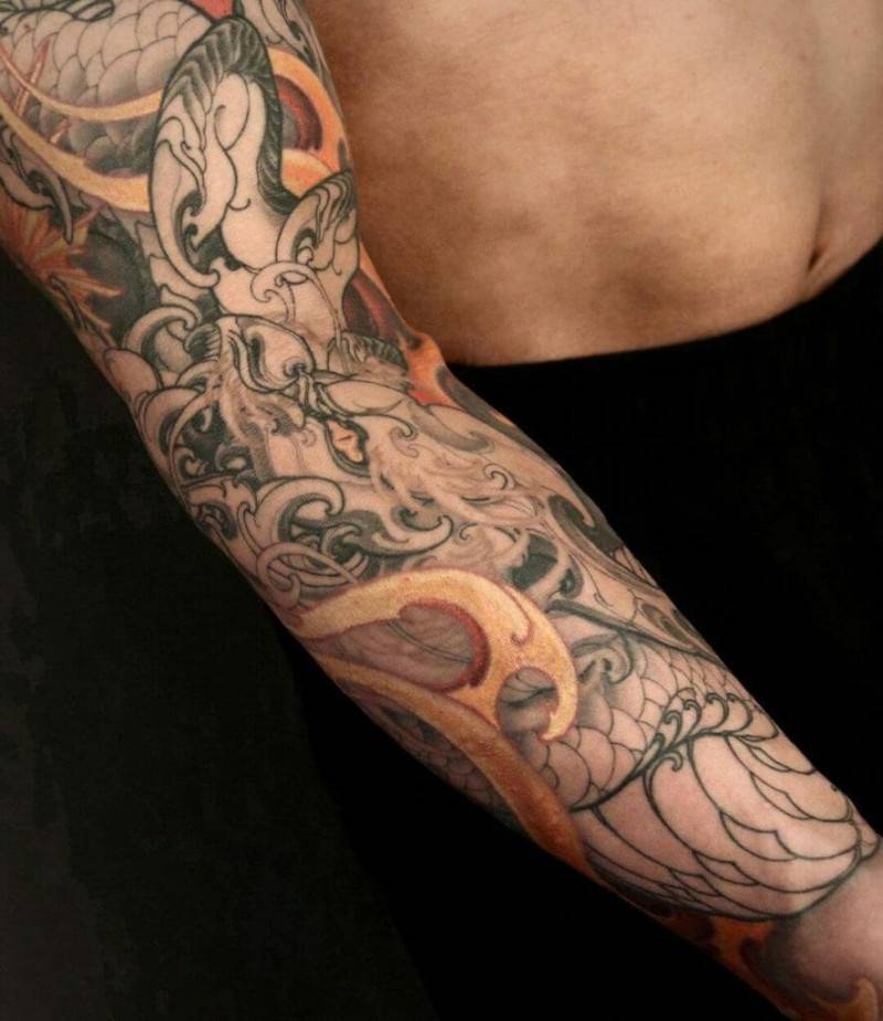 The tattoo artist has covered the entire hand with the Japanese dragon tattoos, making it a great option for sleeve tattoos. Major parts of the dragon tattoo are inked with dark shades with deep coloured outlines to show the separation between different tattoo designs. They are giving rise to several wave Japanese style patterns all over the oriental tattoo sleeve. Some wave-like designs on the dragon are tattooed with a dull yellow hue with some shading effect giving it a 3-D outlook. These types of dragon tattoos are some of the most popular tattoos among the traditional Japanese tattoo design ideas.