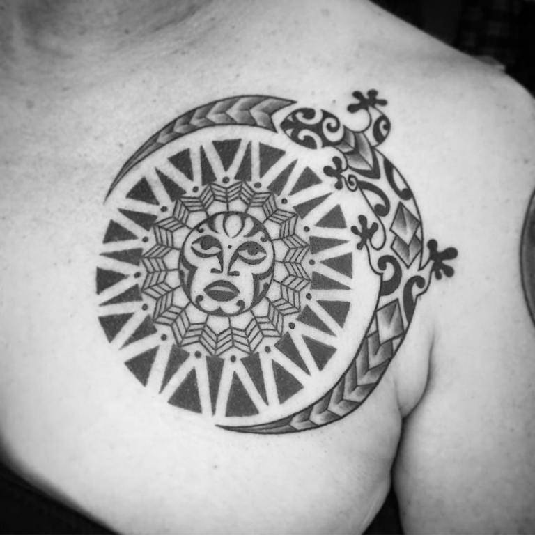 Не менее популярным в тату Полинезии является образ солнца, который обозначает вечность и непрерывность жизни на земле. К носителю данного символа притягивается счастье, удача и добро.