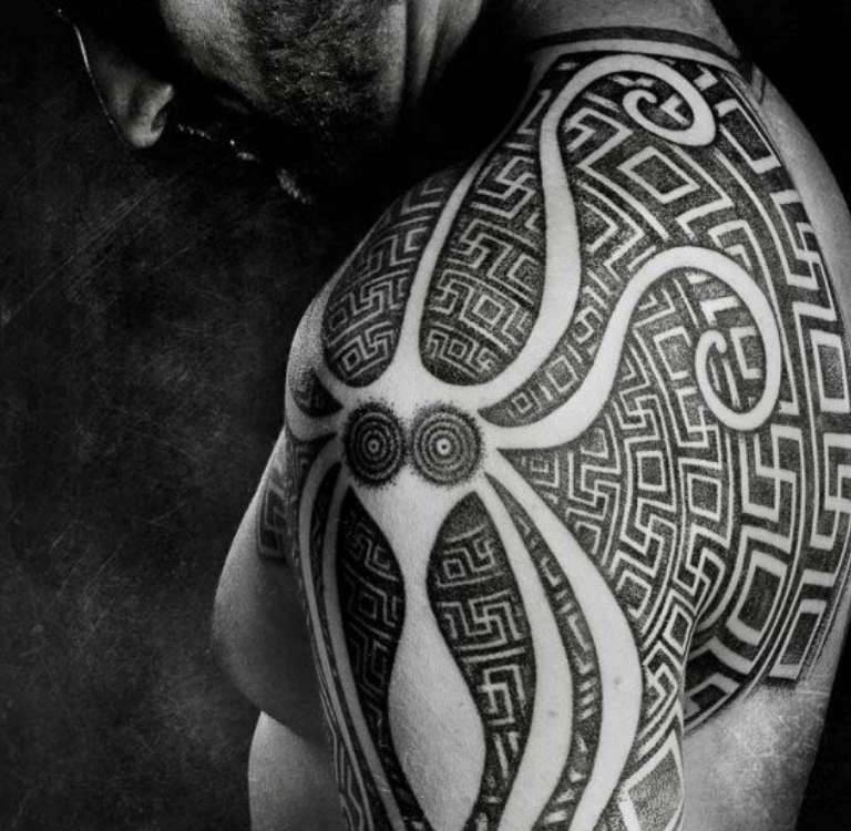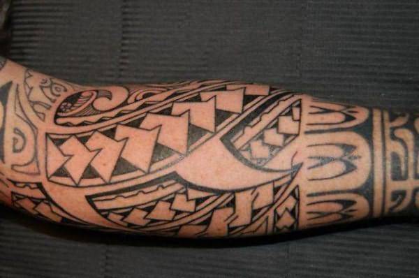 С приходом испанских завоевателей, к сожалению, были утрачены многие источники, из-за чего значение некоторых символов тату Полинезии теперь не поддается расшифровке. Но мужчине такой рисунок все равно придает брутальность и мужественность – особенно если нанести его на предплечье, захватив при этом часть груди.