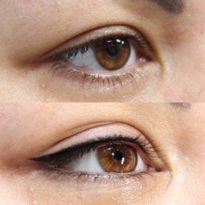 - Фактор неопытного мастера. Самая большая опасность наблюдается тогда, когда татуаж глаз делается плохим специалистом. Он может в силу своей неопытности попросту неправильно подобрать пигмент в том случае, если стрелки делают не черными, или провести неровные линии. Либо же специалист может ввести пигмент слишком близко к поверхности, создав асимметрию. Все это можно откорректировать или у какого-либо другого мастера, или предоставить шанс исправить свои ошибки тому же, кто их и сделал. Бывают ситуации, когда рабочая поверхность чересчур быстро начинает у человека отекать во время работы. Из-за этого мастером может быть пропущен небольшой участок. С фото до и после татуажа стрелок глаз лучше ознакомиться заранее.