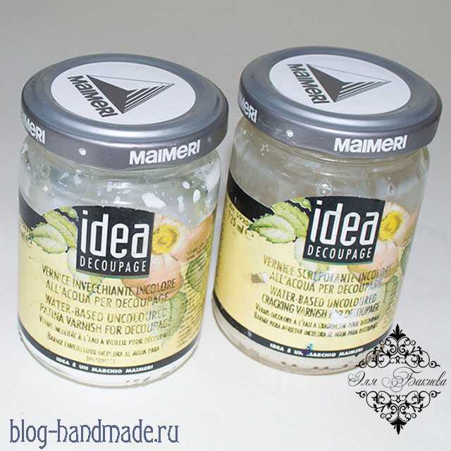 Наиболее удобны для работы в технике декупаж кракелюры на водной основе. Они так же создают на предмете тонкую сеточку трещин, напоминающих паутинку. Все компоненты наносятся очень легко, трещины проявляются достаточно быстро, составы смываются с рук и инструментов теплой водой с мылом.