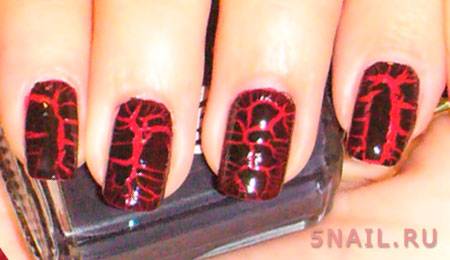 Еще одним результатом применения кракелюрного лака может быть «питоновый маникюр», имитирующий змеиную кожу — для такого эффекта вам нужно нанести черный основной лак и покрыть сверху любым цветным crack-лаком.