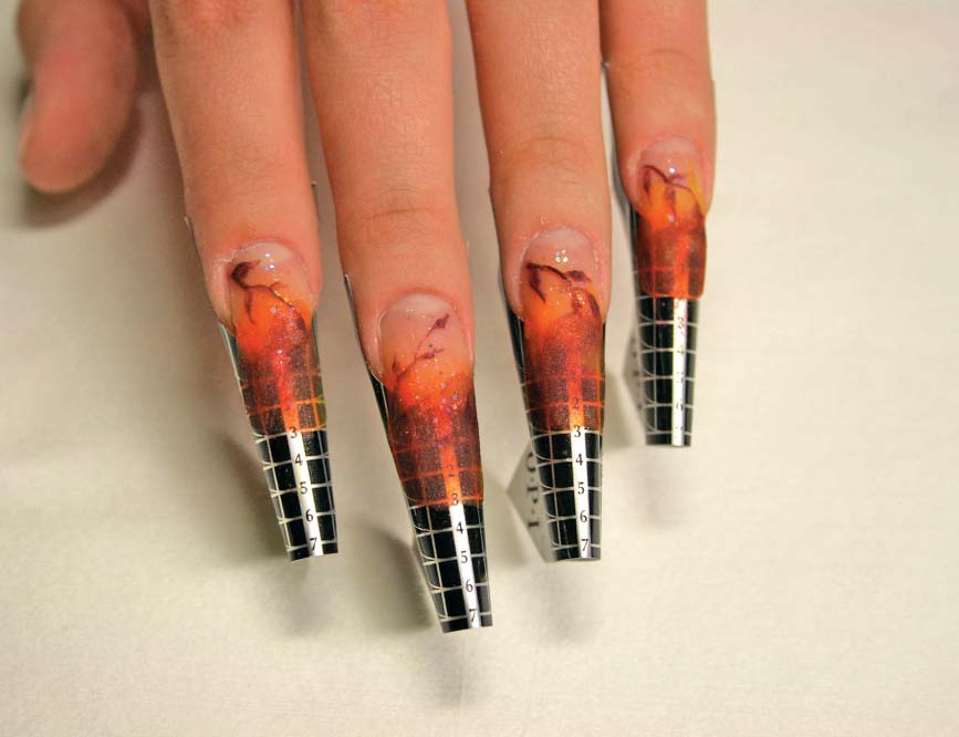 Наращенный на формах ноготок получается естественным и очень аккуратным. Имеющаяся на поверхности градация облегчает моделирование нужной длины и формы, что является еще одним положительным моментом методики.