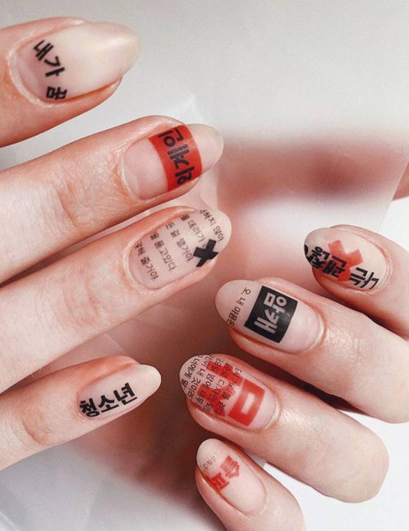 Нюдовый маникюр — спокойная нежная классика. Разбавить ее поможет газетный дизайн или любимые фразы. Просто нанесите их контрастным лаком с помощью слайдера или стемпинга. Можете сделать дизайн более ярким — добавить пару небольших страз, фольги или рисунок.