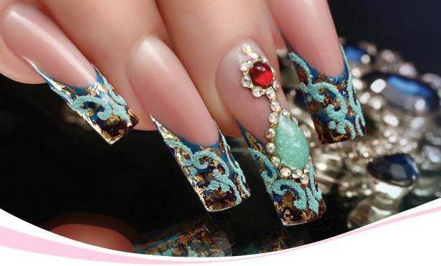 Технология еще называется «ювелирка на ногтях» и заключается в следующем: на ногте рисуют оправу для драгоценного камня, например малахита. Затем в каплю полимера «жидкие камни» помещают несколько оттенков гель-краски и выкладывают в оправу. После покрытия топом можно добавить гель «жидкие камни» сверху на искусственный камушек.