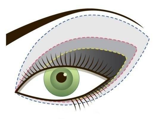 - Более тёмными серыми прокрашивают линию над верхними ресницами и внешний уголок верхнего века.