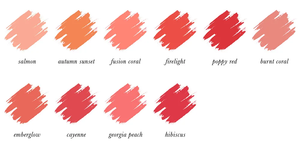 Your best lipstick colours are warm, of medium intensity and not too dark. The peaches are usually more nude lips, while the brighter oranges and corals make for a bold lip. Go for glossy, lustre, shiny or satin finishes.