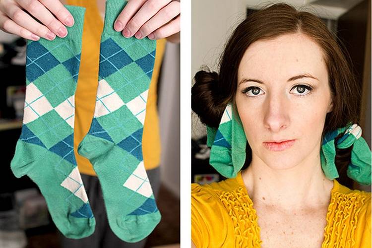 - На середину носка накрутите волосы, начиная с концов.
