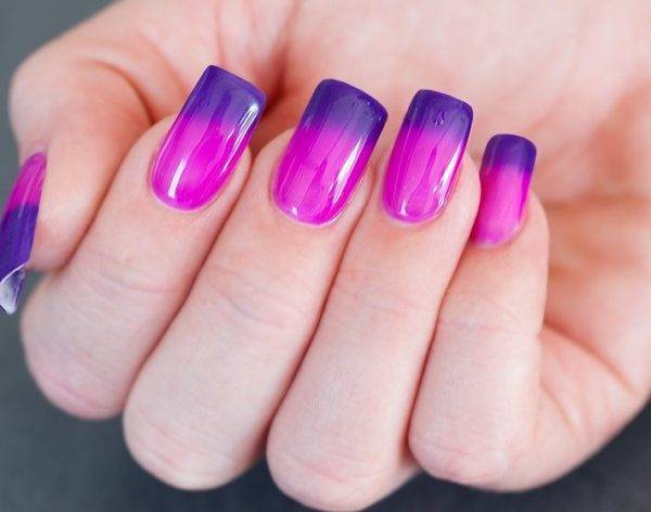 Чтобы сделать градиентный маникюр, необходимо сначала нанести обычный лак, а затем — похожий по оттенку термолак. Таким образом, один цвет начинает плавно переходить в другой.