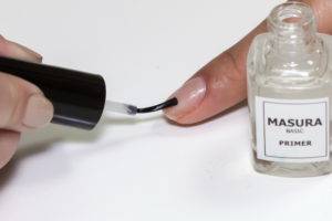 Также лучше не использовать спирт или обычную жидкость для снятия лака, поскольку они не предназначены для обезжиривания, поэтому нельзя быть уверенным в том, что процедура окажется качественной, а это очень важно. К тому же, спирт сильно сушит ногти и кожу вокруг них. Далее следует нанесение праймера