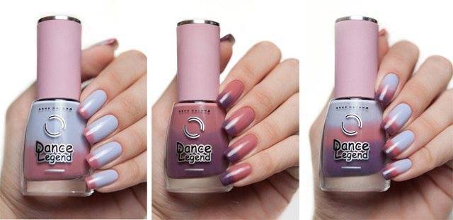 В этом видео можно увидеть необычное трехцветное покрытие от популярного бренда Dance Legend. Оно прекрасно смотрится на ногтях, а при реакции на перемену температур, образует на их поверхности три основных тока и два переходящих.