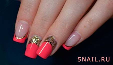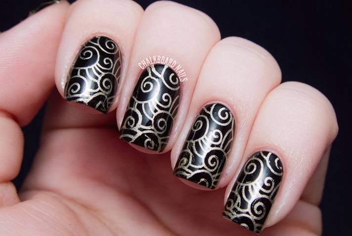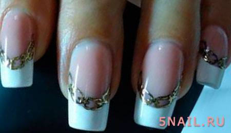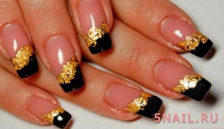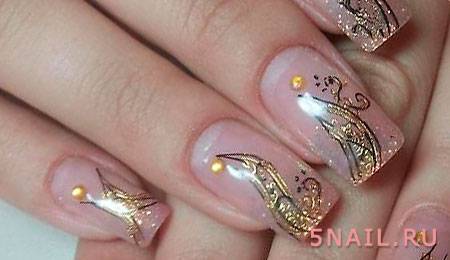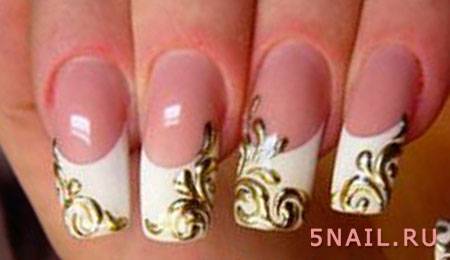 С помощью этой декоративной пленки можно сделать удивительно потрясающие узоры, имитировать литье. В этом случае фольга для дизайна ногтей будет покрывать только отдельные декоративные элементы маникюра. Чаще всего на узорах, орнаменте делается золотистое или серебристое литье. Чтобы пленка не отпечаталась где не нужно, она должна наноситься на гель краску. Делается маникюр литье при помощи декоративной пленки так: