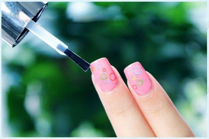 - Закрепитель. Тонкое прозрачное покрытие наносится на готовый маникюр. Оно предотвращает появление царапин на фольге, укрепляет все слои лака, придает эффектный блеск.