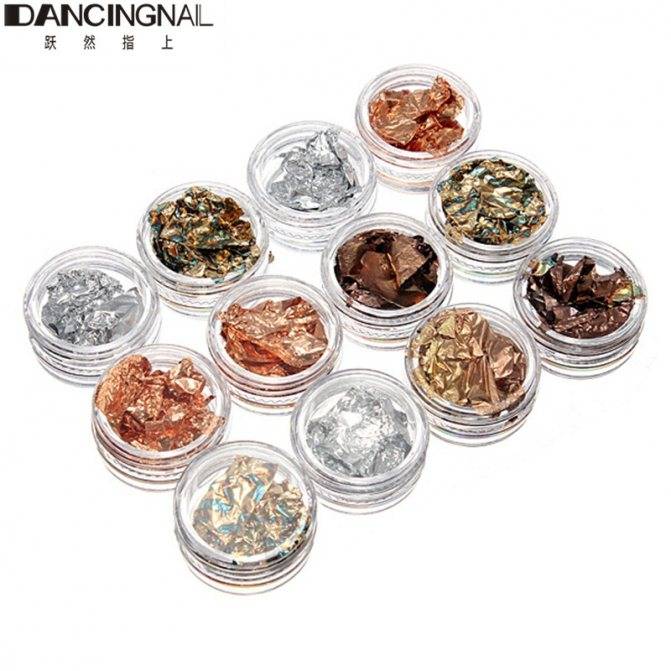 Жатая фольга продается в специальных контейнерах. Она очень тонкая, похожая на сусаль. В сосуде материал размещен в жатом, скомканном виде. Завоевал широкую популярность в создании аквариумного маникюра на наращённых ногтях.
