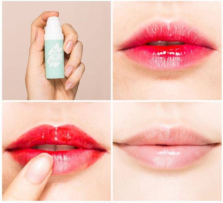 Стойкость пигмента в тинтах не позволяет просто стереть его с губ. Для того, чтобы удалить тинт, необходимо приобрести жидкость для снятия макияжа. Смочив ватный спонж в этом средстве, тинт стирают массирующими движениями. Эффективнее всего применять двухфазные средства для снятия водостойкой косметики.