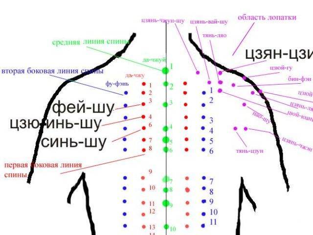 Во время массажа спины задействуют точки, облегчающие боль. Они отвечают также за стрессовое состояние, усталость, переутомление, слабость. Основная БАТ находится в месте соединения мышц шеи, плеч и позвоночника в верхней части спины. Вторая расположена между лопатками по обе стороны от позвоночника (примерно на расстоянии 1 см). Воздействовать на парные точки нужно одновременно для большей эффективности. Точки на спине обычно прорабатываются во время классического массажа, и оказывают общий укрепляющий и оздоравливающий эффект.