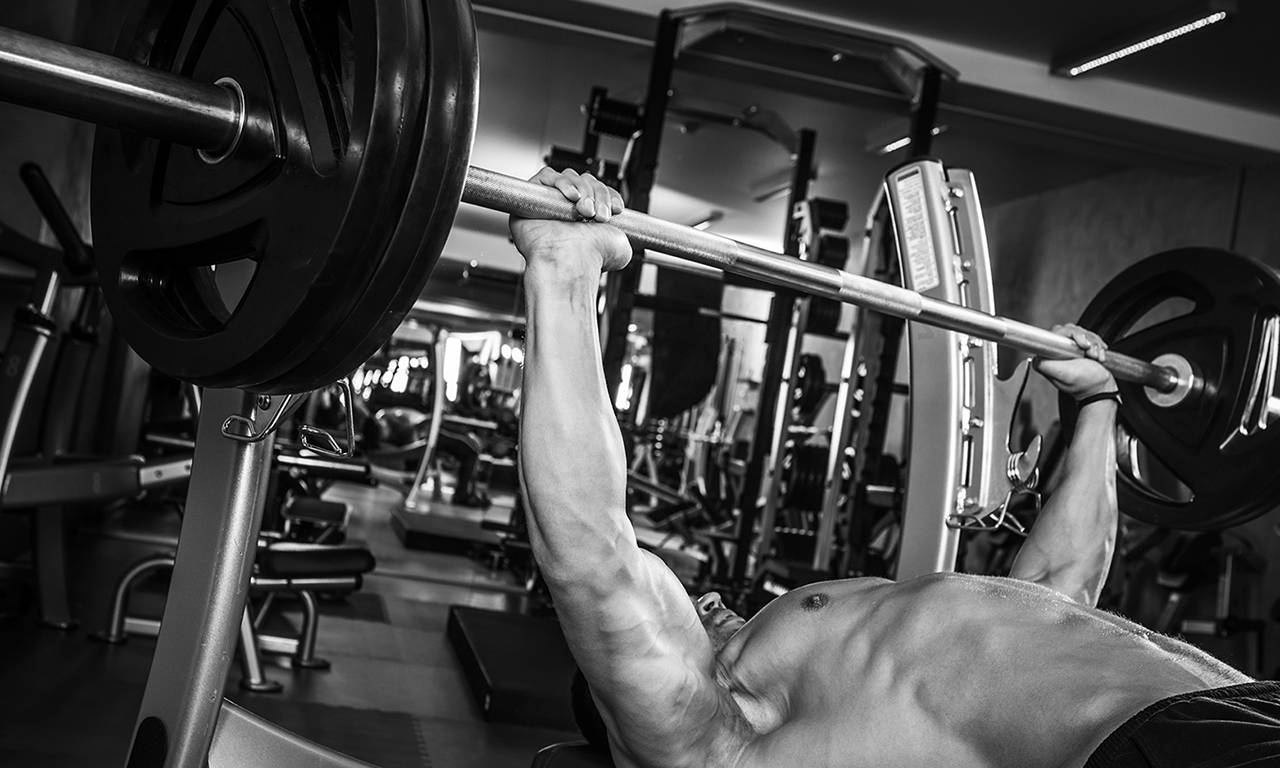Жим штанги на горизонтальной скамье.