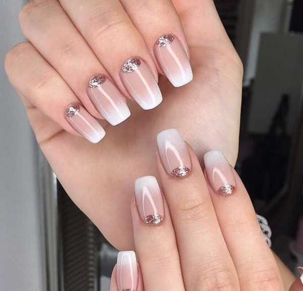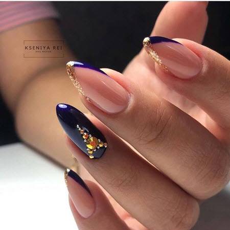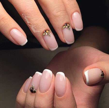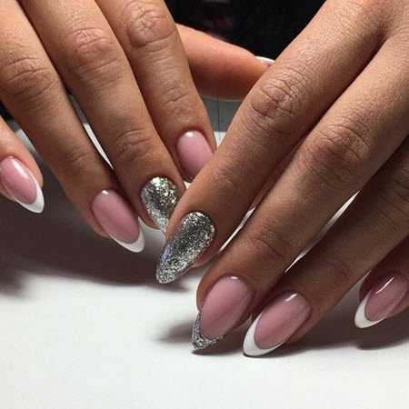 По-прежнему в моде лунный дизайн со стразами, разграничивающими лунку и ногтевую пластину. Модный зимний маникюр использует серебристый и золотистый гель лак, комбинацию в одном образе классического и обратного френча.