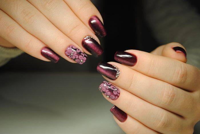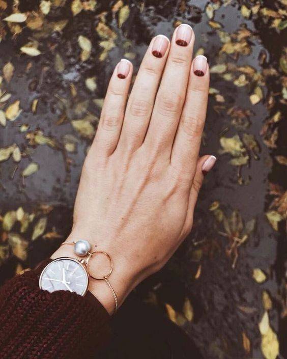 В осенне-зимнем сезоне незаменимыми становятся темные, глубокие оттенки лака. В данном случае речь идет о малиновом, красновато-коричневом оттенке, а также бургунд и бордо. Каждый из них выглядит благородно, изысканно. Такое покрытие уместно не только для вечернего выхода, но и прекрасно дополняет деловой образ. Буквально все говорит о его универсальности.