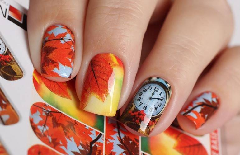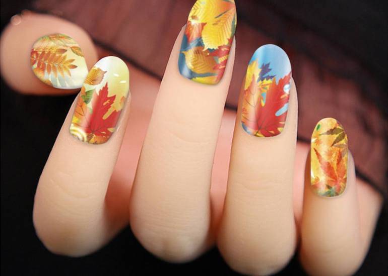 • применение наклеек – это самый лёгки способ воссоздать осенний дизайн на ноготках. Нет ничего проще, чем нанести на подготовленную цветную поверхность ногтя наклейки в виде листвы различной формы и цвета. Выполняется дизайн очень просто, а смотрится довольно аккуратно и эстетично.