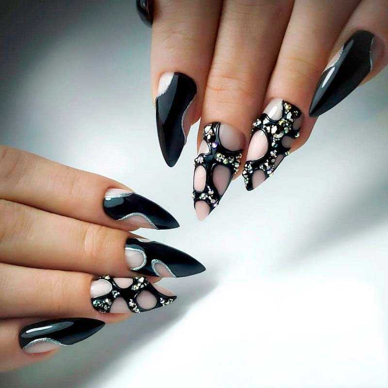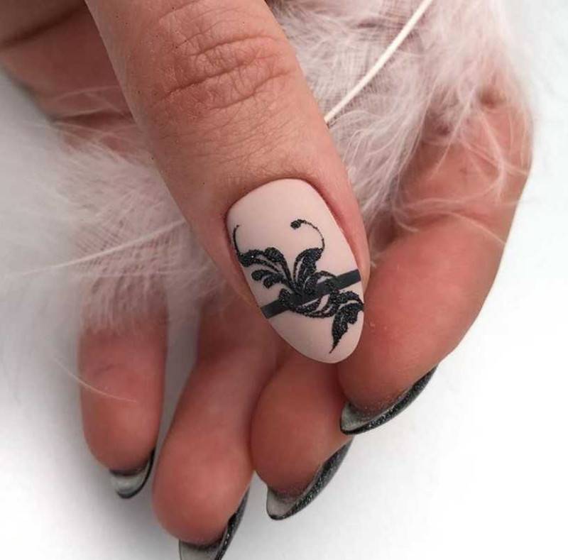 Можно выбрать декор повседневного типа или для важной встречи. Черный маникюр с рисунком часто выбирают на выпускной, юбилей. Картинки могут быть выбраны по собственному решению или по совету мастера, подходящие под соответствующую ситуацию, оттенок наряда