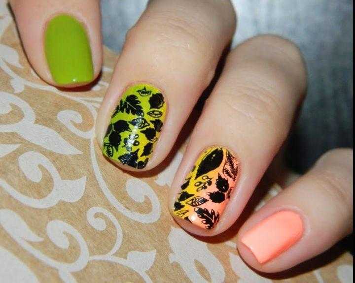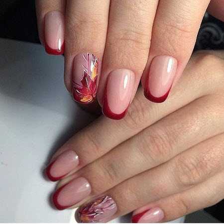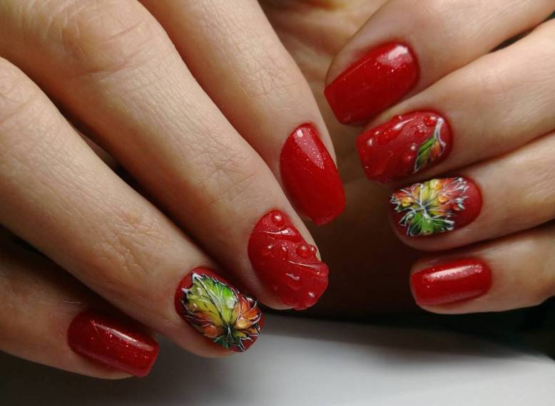 Нет ничего проще, чем нанести на подготовленную цветную поверхность ногтя наклейки в виде листвы различной формы и цвета. Выполняется дизайн очень просто, а смотрится довольно аккуратно и эстетично