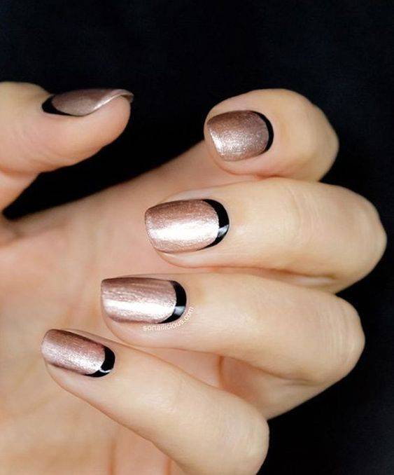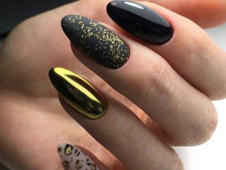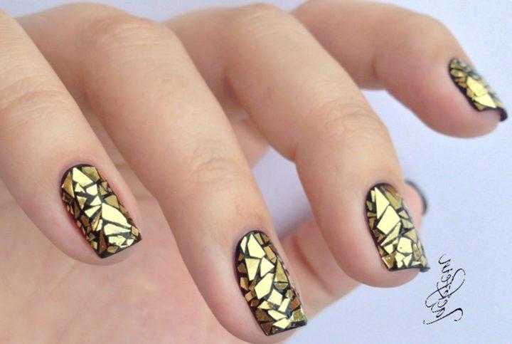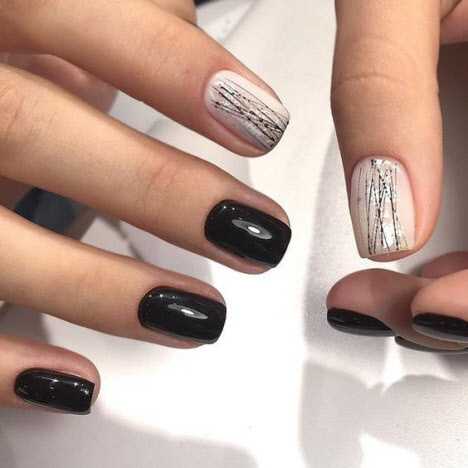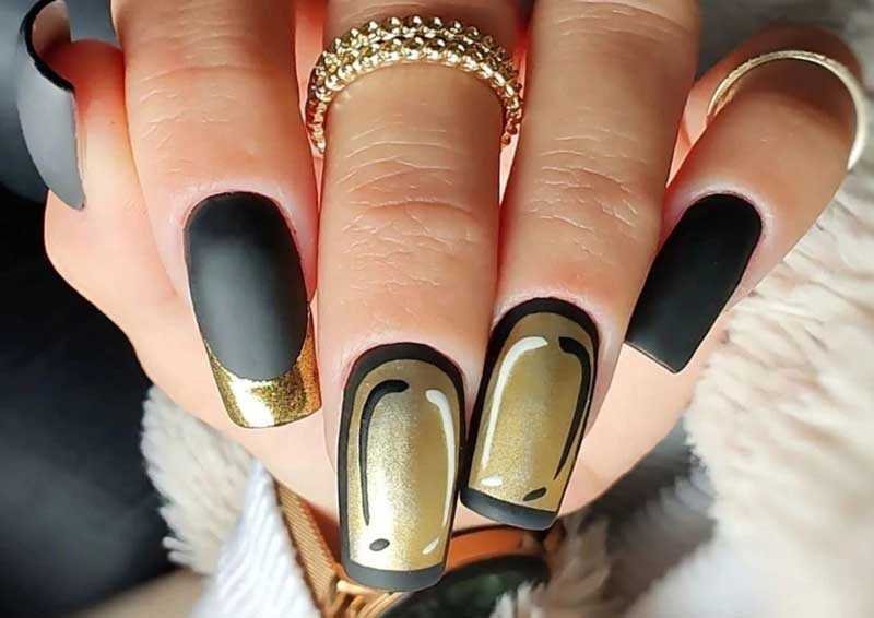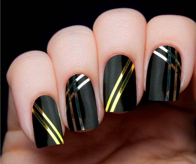 • чёрный с золотом – очень уместно покрывать ногти осенью в чёрный угольный цвет и разбавлять его мрачность геометрическими линиями золотого цвета, которые можно воссоздать с помощью клейкой тонкой ленты; потрясающее сочетание этих двух цветов как нельзя ярче отражает осеннюю стилистику и при этом выглядит очень экстравагантно;