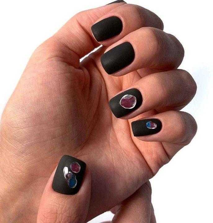 Чрезвычайно популярен черный маникюр с лунками, выполненными в технике зеркальной втирки.