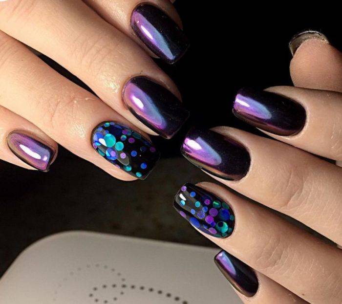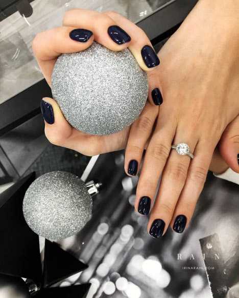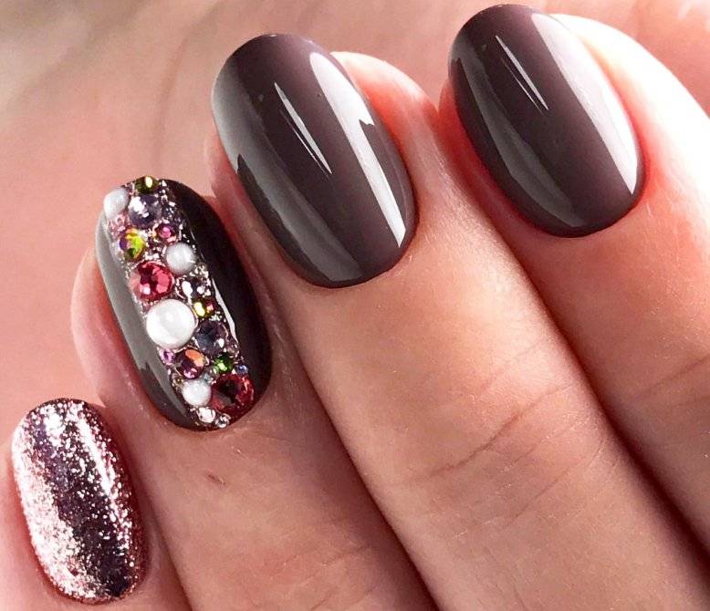 Маникюр в темных тонах прекрасно смотрится с камушками, глиттером, конфетти, фольгой, выложенными в разных вариантах, а также в минималистическом дизайне (линии, фигуры, точки, орнаменты). Создавайте интересный маникюр с помощью смешивания сразу нескольких техник, совершенствуя привычные маникюрные стандарты.