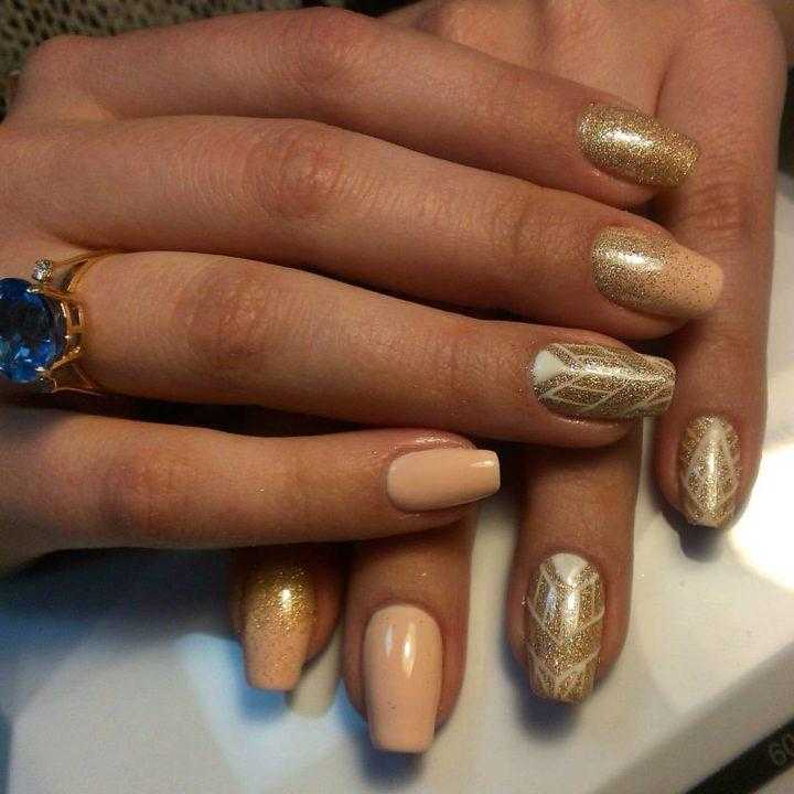Ноготки в нюдовых тонах с золотой фольгой выглядят лаконично и стильно. Главное не переборщить с золотом.