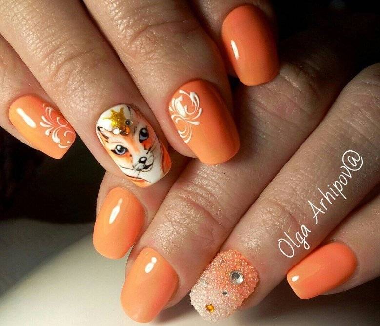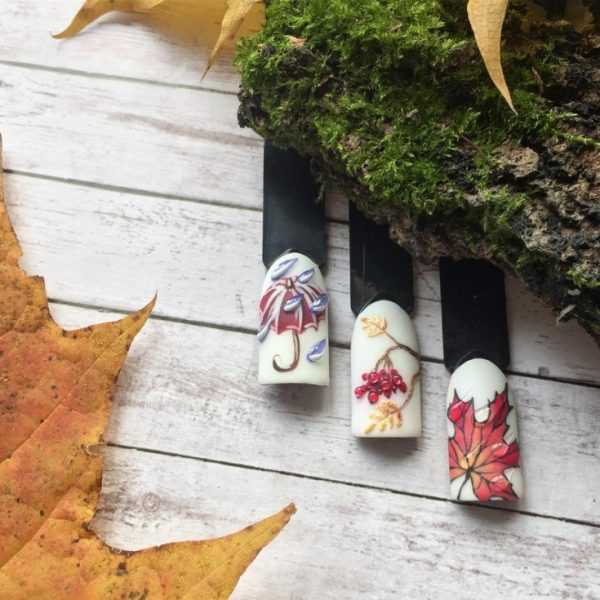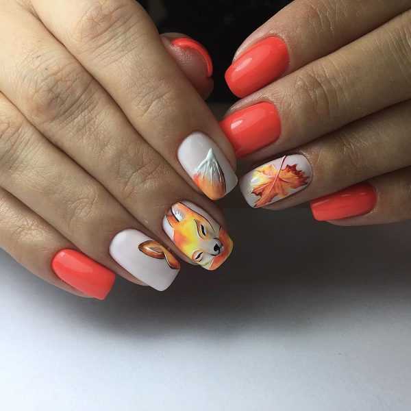 С рисунком. Изображать разноплановые рисунки на ноготках — очень милый тренд, который не теряет своей популярности. На овальных ноготках или форме квадрат можно изобразить животных, кленовые листья, зонтик с дождем, грибы, очаровательные тыковки и другие узнаваемые символы осени. А если площадь позволяет, то и целые пейзажи. Интересные идеи для осеннего маникюра с рисунком можно подсмотреть в нашей фото-подборке.