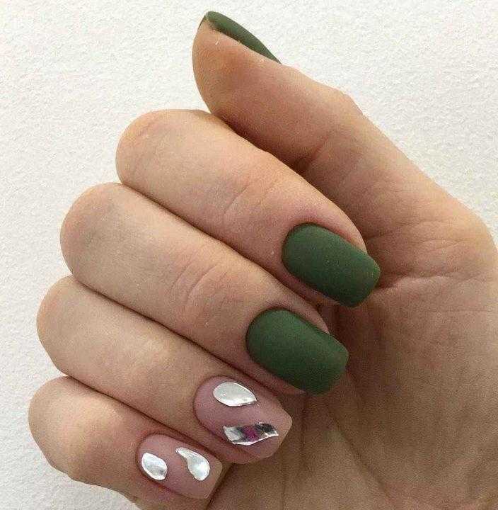 Самые актуальные в сезоне 2022 оттенки хаки. это и модный оливковый, и армейский зеленый. В осеннем маникюре вы сможете сочетать два самых модных направления — хаки и рисунок рябины. Только не перебарщивайте. Здесь актуально правило — минимализм или выделение всего одного ноготка.