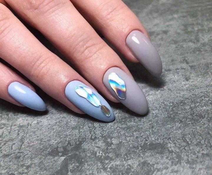 Нежный серый цвет на всех пальчиках, но на одном из них рисунок имитации мрамора или металлический ноготок.