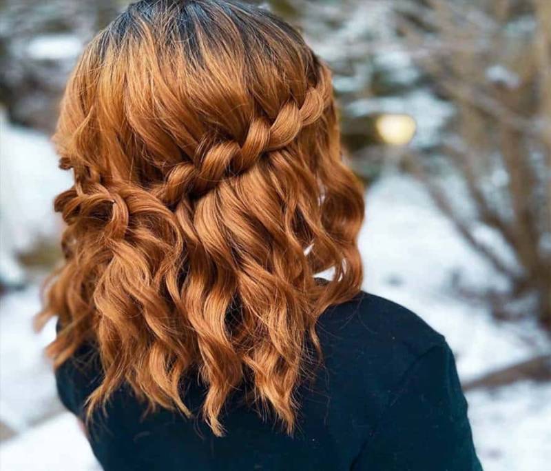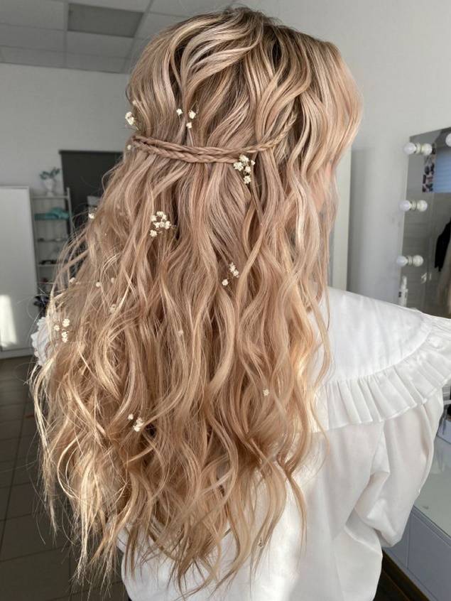 Невероятно красивой вечерней прической 2021-2022 на длинные волосы станет укладка на бок, сочетающая плетение и завитые локоны.