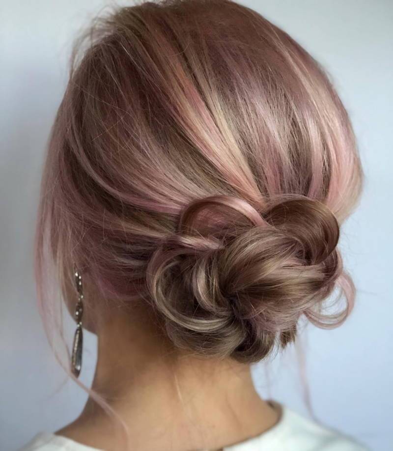 Не новая, но снова ставшая популярной укладка. Если пряди длинные, крепкие, попробуйте собрать их в пучок. Гладко укладывать волосы у головы не обязательно – можно создать легкий беспорядок.