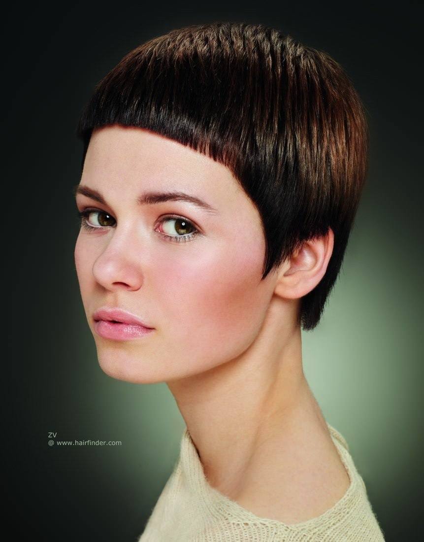 Такая стрижка максимально открывает лицо, поэтому выбирать такой вариант нужно лишь в том случае, если вы уверены в своей внешности. Форма челки может быть прямой, косой, рваной, асимметричной. В итоге у вас получается невероятно милых и хрупкий образ