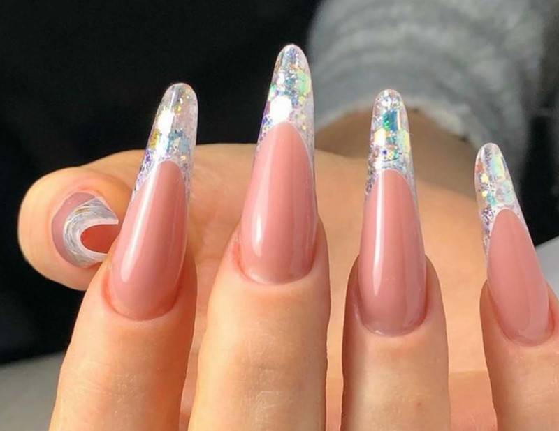 - Миллениум. На кончик ногтя наносятся блестки, акрил с блестящими вставками. Особенно эффектно смотрится такой маникюр на длинных ногтях.