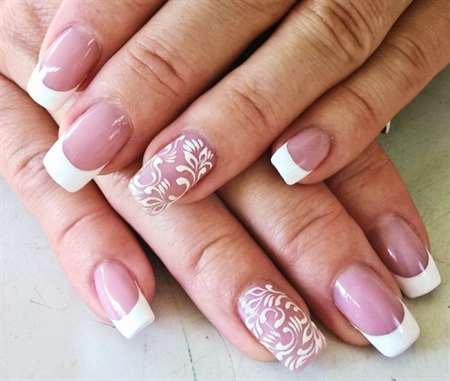 Мечтательным и романтичным девушкам подойдёт френч с основой нежных оттенков розового или фиолетового, с витиеватым кружевным рисунком или цветочным орнаментом