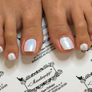 - Шик и блеск. Мерцающий педикюр будет выглядеть актуально с любым платьем невесты. Для зеркального блеска используйте втирку, а сверкающие акценты расставьте с помощью пайеток.