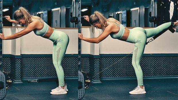 Для этого упражнения требуется специальный кабельный тренажер с блоками. Присоединяем кольцо к нижнему блоку тренажера, а затем продеваем в кольцо ногу. Затем встаем лицом к тренажеру и держимся за него обеими руками. Медленно отводим ногу назад как можно дальше. Затем так же медленно возвращаем ее в исходное положение. Выполняем все повторы одной ногой, а затем другой.