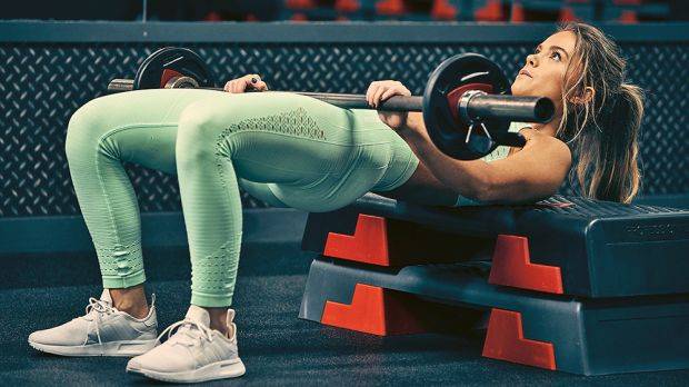 Садимся на пол так, чтобы скамья была за спиной. Штанга лежит на бедрах, расположена чуть ниже их линии. Отклоняемся назад и слегка поднимаем бедра так, чтобы плечи лежали на скамейке. Теперь толкаем бедра вверх, чтобы поднять штангу. В самом высоком положении колени должны быть согнуты под углом 90 градусов, а тело от плеч до колен должно представлять собой прямую линию. Медленно опускаемся в исходное положение.