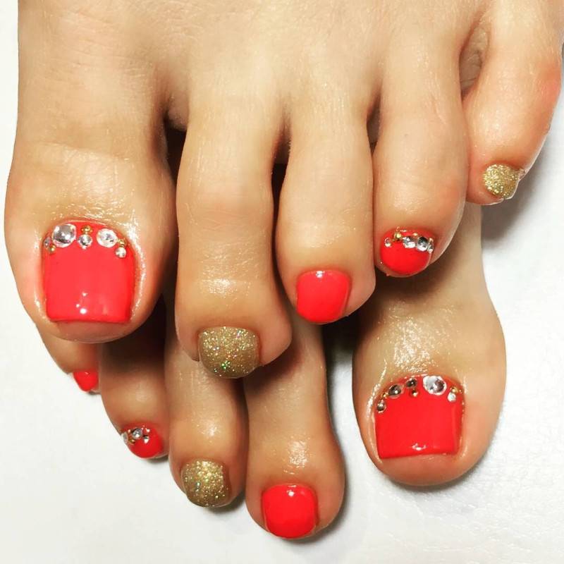 Помимо узоров, на ногти можно нанести блестки, камешки или сусальное золото. Таким образом, вы сможете создать праздничный маникюр и педикюр в одном стиле. Элементы декора могут быть нанесены на один ноготь или на несколько. При педикюре рекомендуется наносить декор только на большой палец ноги.