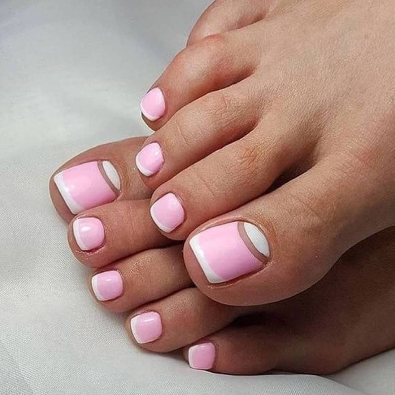 Французский педикюр пользуется большим спросом. Причем не только в классических тонах, таких как розовый, нюдовый и белый, но и с флуоресцентными и пастельными тонами.