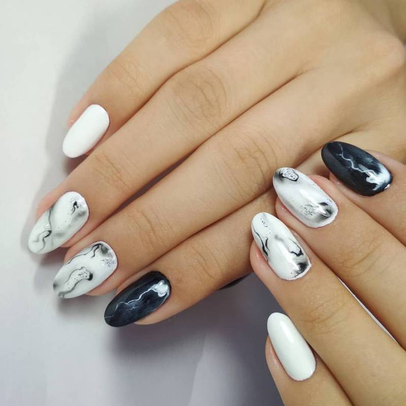 Мраморный маникюр смотрится очень нежно и сдержанно. Натуральные текстуры на ногтях облагораживают ноготки, делают пальчики тоньше и изящнее. Мраморный маникюр наиболее уместно смотрится на длинных миндальных ногтях.