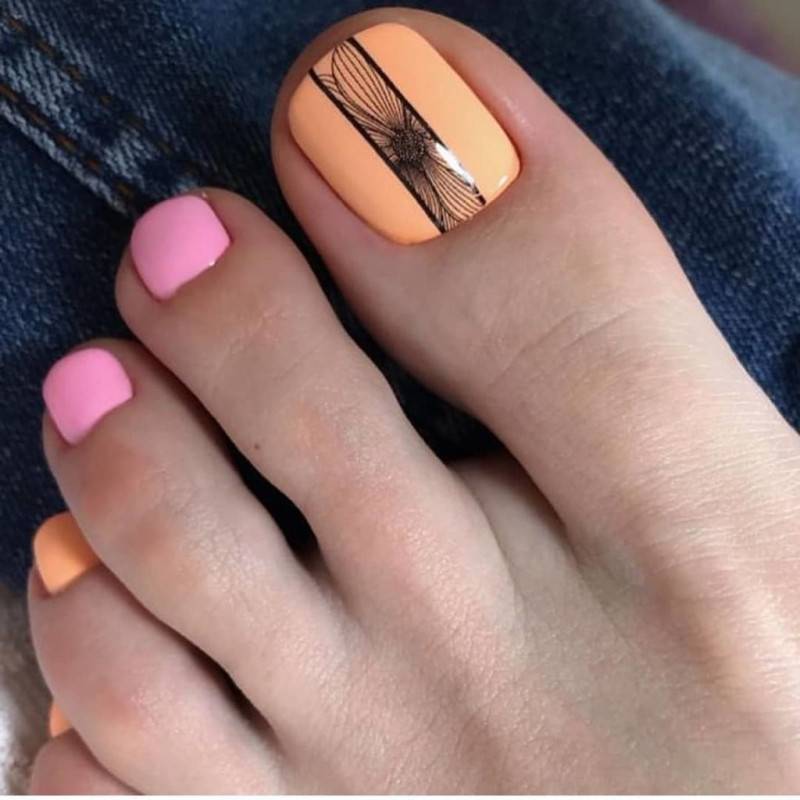 В летний сезон пастельные оттенки, такие как оранжевый или розовый, никогда не подводят в педикюре. Они всегда присутствуют в модных списках на лето. Новинка этого года с точки зрения текстур — матовое покрытие. Это чистый тренд, потому что оно создаст пудровый эффект на ваших ногтях.