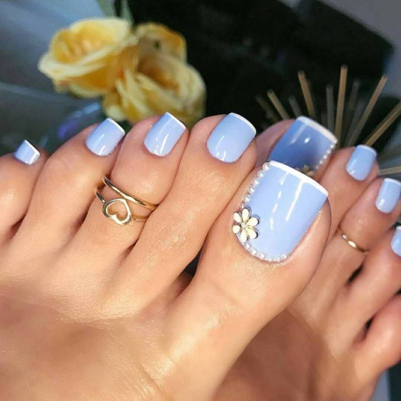 Педикюр в более ярких тонах, таких как синий, уникальным образом подчеркивает ноги. Кстати, загар с таким цветом выделяется не менее чем с белым.
