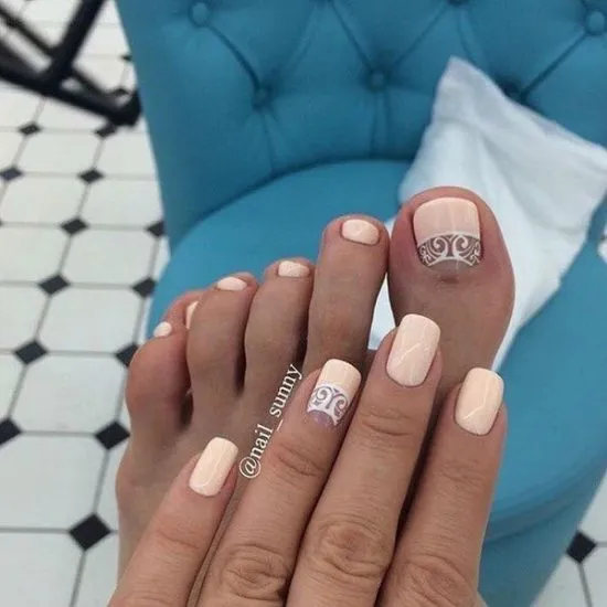 Бежевый лак выглядит элегантно и нежно. Бежевый выглядит элегантно и стильно, выглядит элегантно и стильно. Очень женственно выглядит розовый маникюр и педикюр в одном стиле. Нотку свежести в дизайн вносят голубой и салатовый цвета. Также рекомендуются пастельные цвета, молочный и бледно-желтый.