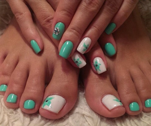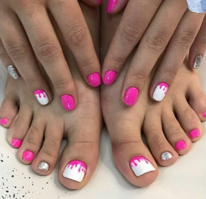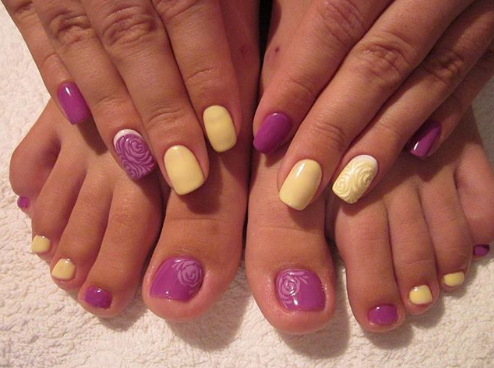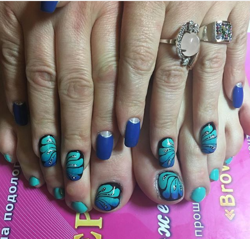 Сегодня в моде летний маникюр и педикюр в разных оттенках, сочетающий в себе элемент повторения в дизайне ногтей.