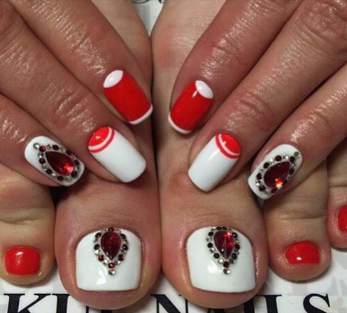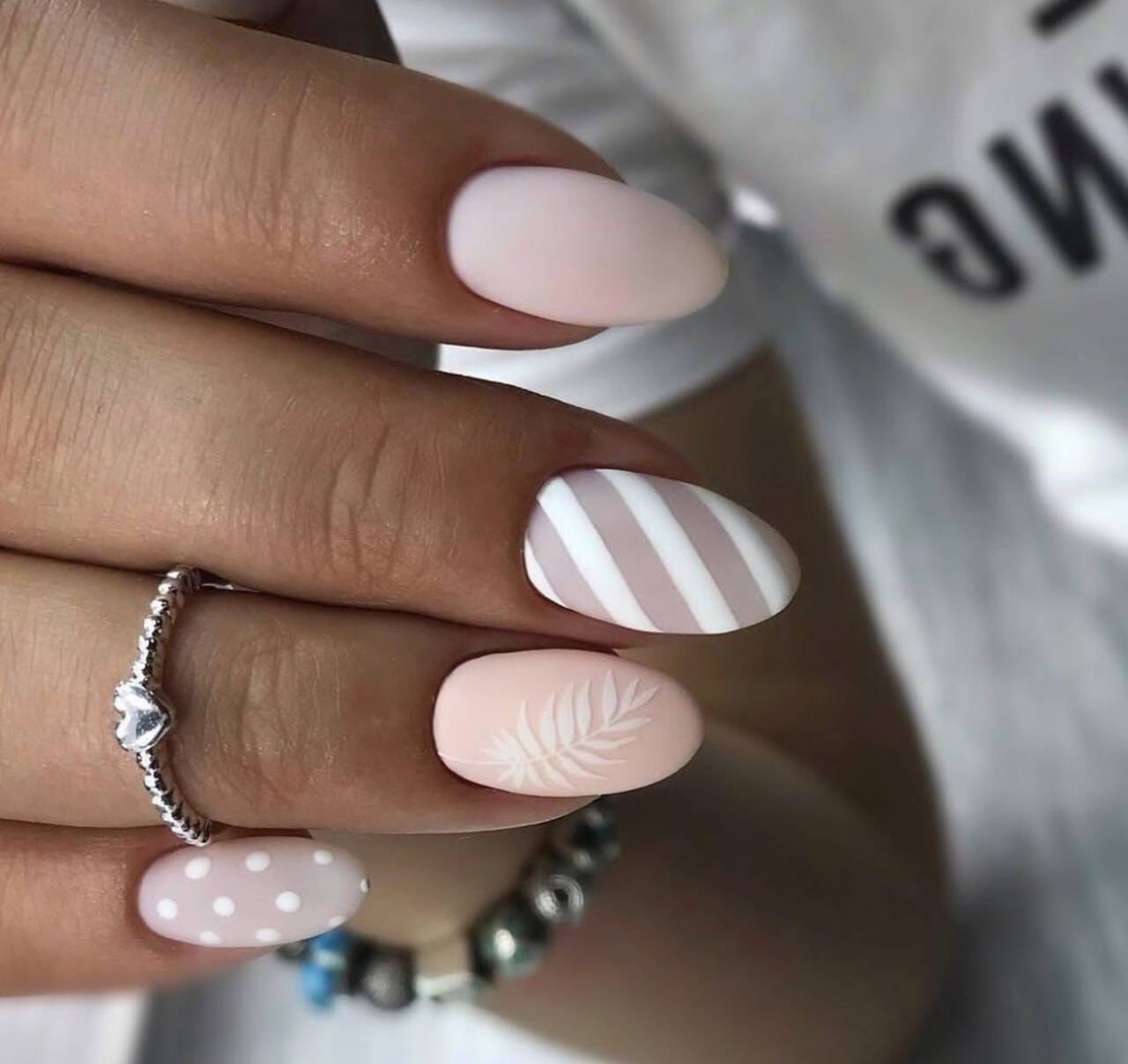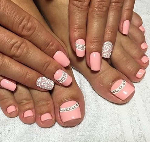 Красивый маникюр и педикюр в разных оттенках может сочетать в себе прорисованные углубления, технику французского нейл-арта, омбре, а также повторяющийся рисунок, геометрические узоры, полоски, горошек.